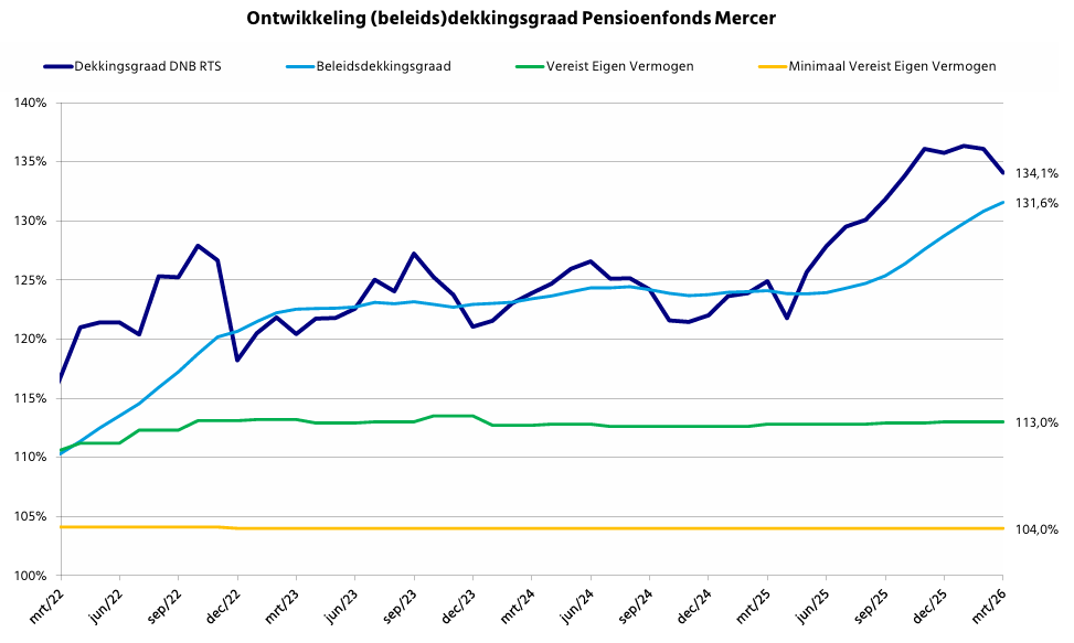 De beleidsdekkingsgraad van Pensioenfonds Mercer is eind maart uitgekomen op 131,6%. Dat is 0,8%-punt hoger dan de beleidsdekkingsgraad van februari 2026.